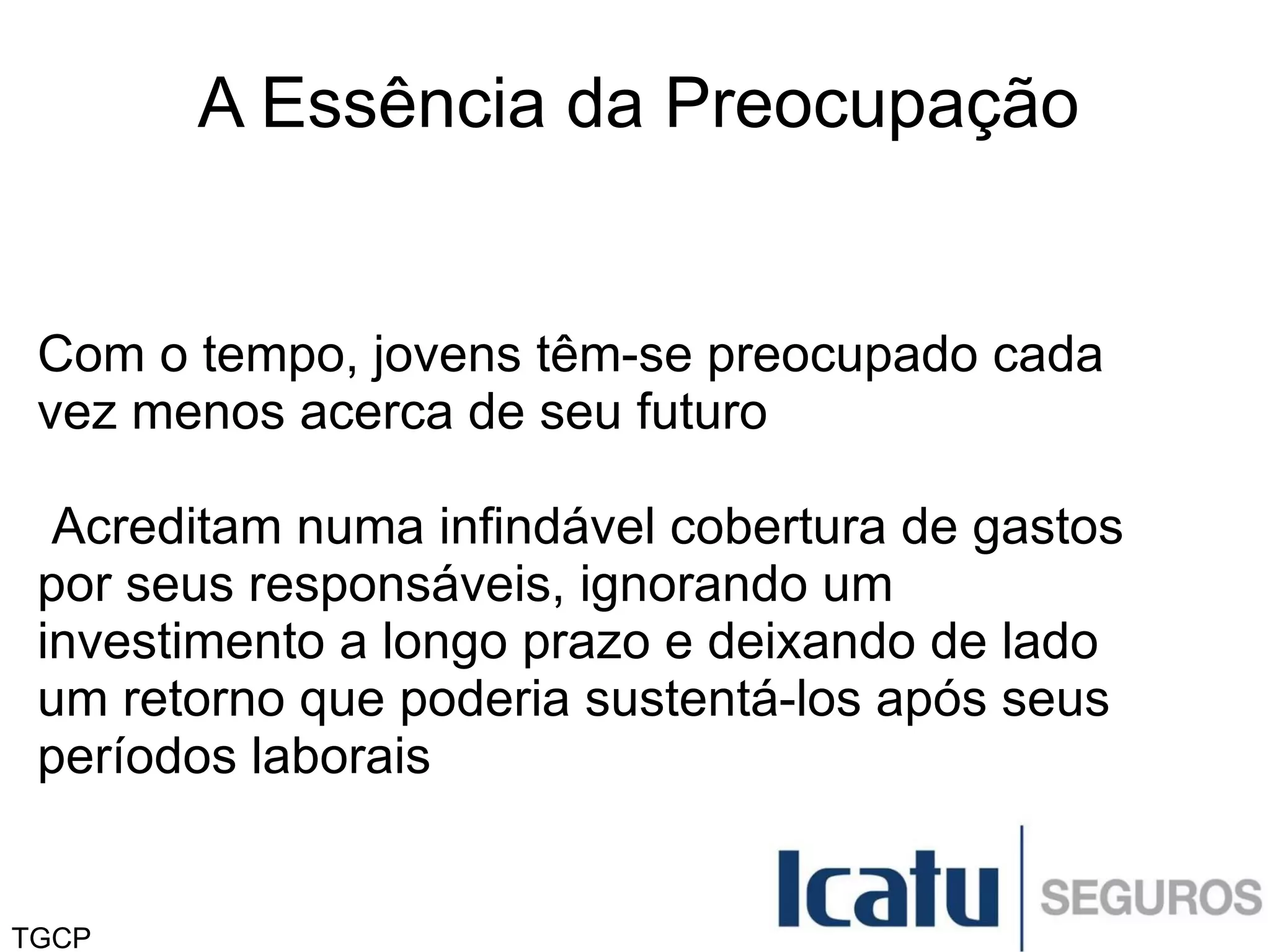 O documento discute a importância de planejamento financeiro desde a juventude para garantir segurança no futuro. Defende que com a expectativa de vida aumentando, jovens devem começar cedo a poupar e investir parte de sua renda mensal para ter uma aposentadoria confortável e cuidar de suas futuras responsabilidades como casamento, filhos e herança.
