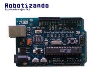 O documento descreve o que é Arduino e fornece exemplos de seu uso. Também discute como os desenvolvedores projetaram sua própria placa Arduino ao remover componentes difíceis de encontrar e desenvolver seu próprio bootloader e implementação de padrão USB por software. Por fim, fornece um cronograma para a formação de grupos, fabricação de placas, montagem de componentes e testes.