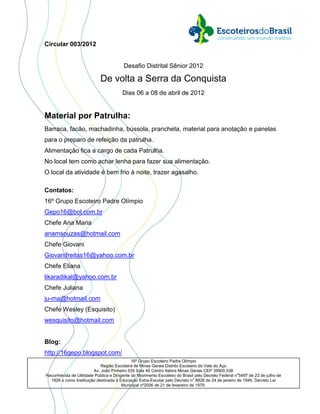 O documento fornece informações sobre o Desafio Distrital Sênior 2012, que ocorrerá entre os dias 6 e 8 de abril na Serra da Conquista. Ele lista os materiais necessários para cada patrulha e informa que a alimentação ficará a cargo de cada uma. Também recomenda levar agasalho devido às baixas temperaturas à noite no local. Por fim, fornece os contatos dos chefes organizadores do evento.
