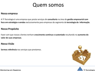 O documento discute os desafios para o crescimento sustentado de empresas de tecnologia, abordando aspectos internos e externos. Entre os desafios externos estão manter a inovação no produto, adequar a estratégia de preços, ampliar o alcance geográfico e desenvolver canais de distribuição. Internamente, a empresa precisa estar estruturada com processos bem definidos e reter talentos qualificados.