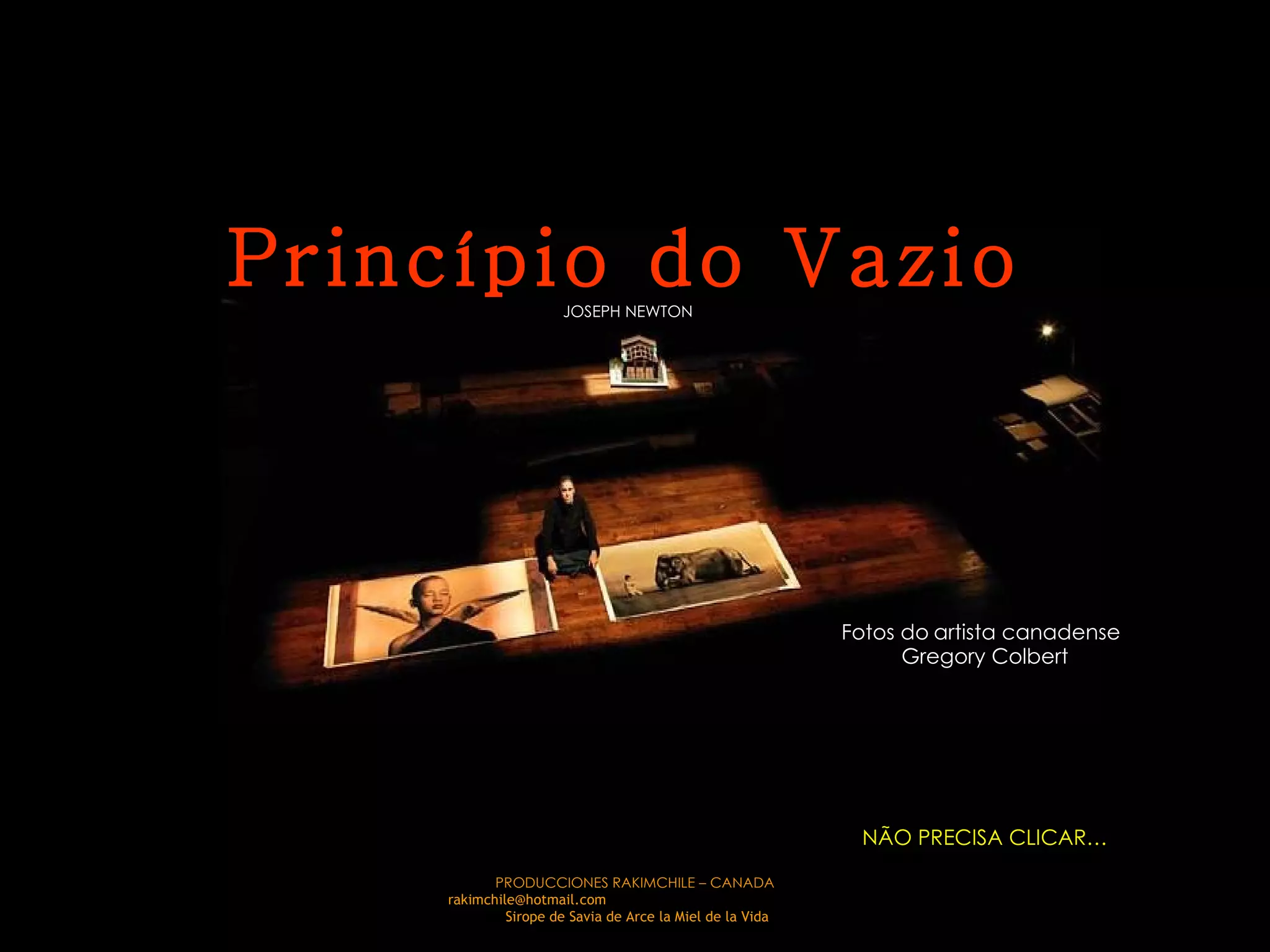 Princípio do Vazio JOSEPH NEWTON PRODUCCIONES RAKIMCHILE – CANADA rakimchile@hotmail.com Sirope de Savia de Arce la Miel de la Vida Fotos do artista canadense Gregory Colbert NÃO PRECISA CLICAR…