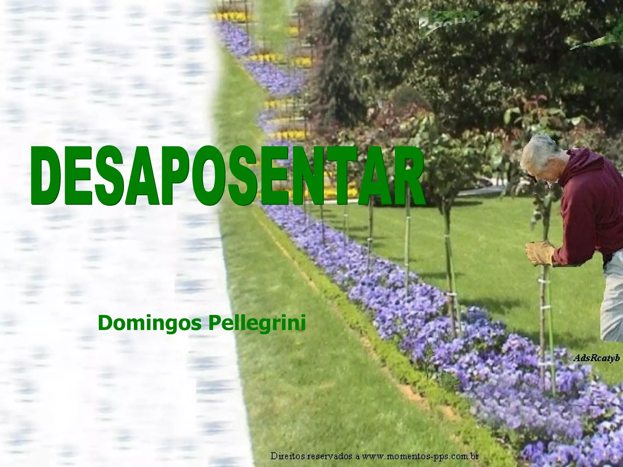 Domingos é um aposentado que cuida de uma praça plantando árvores e regando as mudas. Ele se considera "desaposentado" pois continua muito ativo cuidando da praça e ajudando a esposa com várias atividades. Ele explica como aprendeu muito sobre plantas e a natureza cuidando da praça e gosta de ver a praça florescendo, mesmo sem apoio da prefeitura.