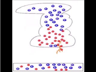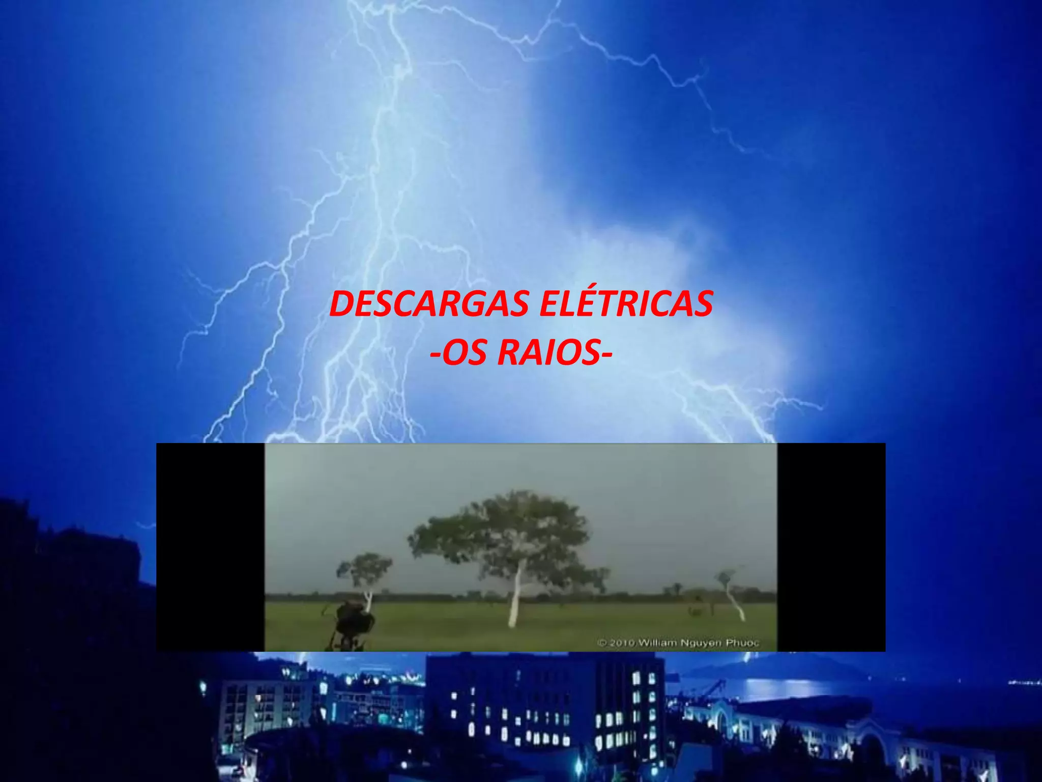 O documento descreve os raios, relâmpagos e trovões. Explica que os raios são descargas elétricas entre nuvens ou entre uma nuvem e o solo, causadas pela separação de cargas elétricas dentro das nuvens. Os relâmpagos são os clarões intensos e os trovões são os barulhos que ocorrem após o raio.