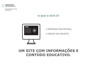 O documento descreve as especificações de um site sobre coleta seletiva e sustentabilidade. O site terá informações sobre o desempenho de bairros na coleta seletiva, dados coletados e destino do lixo, além de conteúdo educativo como matérias e vídeos. O site também terá áreas de votação e discussão sobre os benefícios do projeto.