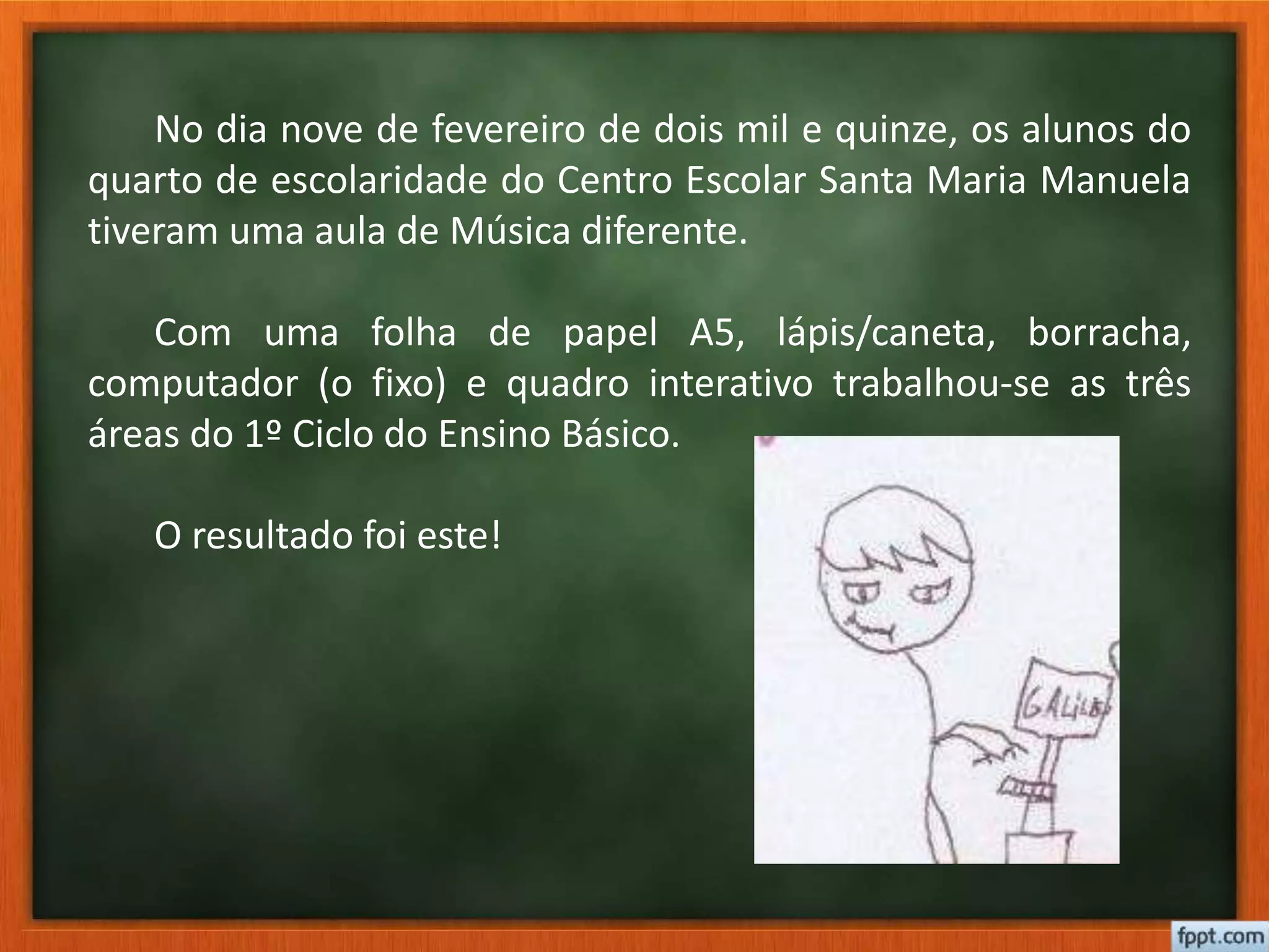 Os alunos do quarto ano tiveram uma aula de música diferente em 9 de fevereiro de 2015 onde usaram papel, lápis, computador e quadro interativo para trabalhar as três áreas do primeiro ciclo do ensino básico.