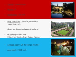 O documento fornece informações gerais sobre o Luxemburgo, incluindo sua capital, moeda, população, línguas oficiais, governo, área total e data de entrada na União Europeia. Também destaca alguns pontos turísticos importantes como a Catedral de Notre-Dame em Luxemburgo, o Banco Europeu de Investimento, a Philharmonie e as regiões de Esch-sur-Sûre, Vianden, Clervaux e Müllerthal.