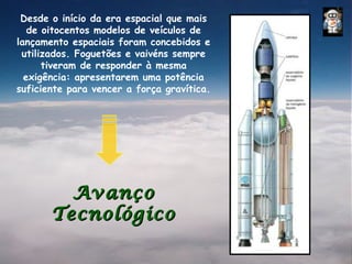 O documento discute a exploração espacial, incluindo o lançamento de satélites artificiais e foguetes, o uso de sondas espaciais para estudar outros planetas, e o desenvolvimento de telescópios, estações espaciais e o vaivém espacial.