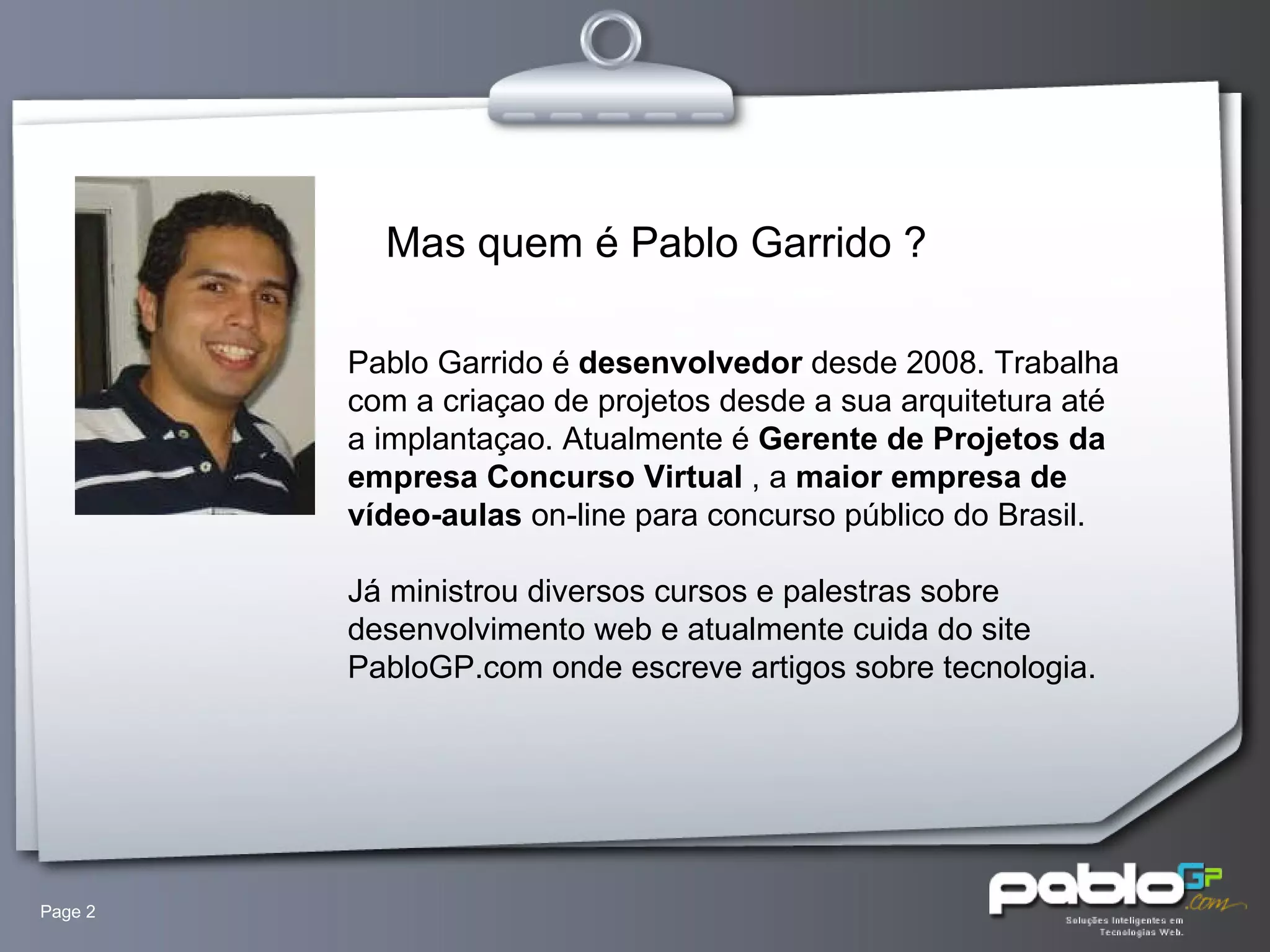 Page PabloGarrido é desenvolvedor desde 2008. Trabalha com a criaçao de projetos desde a sua arquitetura até a implantaçao. Atualmente é Gerente de Projetos da empresa Concurso Virtual , a maior empresa de vídeo-aulas on-line para concurso público do Brasil. Já ministrou diversos cursos e palestras sobre desenvolvimento web e atualmente cuida do site PabloGP.com onde escreve artigos sobre tecnologia. Mas quem é Pablo Garrido ?