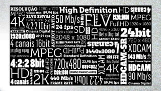 O documento discute formatos de vídeo, incluindo resolução, taxa de quadros e proporção de tela. Explica como esses formatos se relacionam e como afetam a captação, finalização e exibição de vídeos.