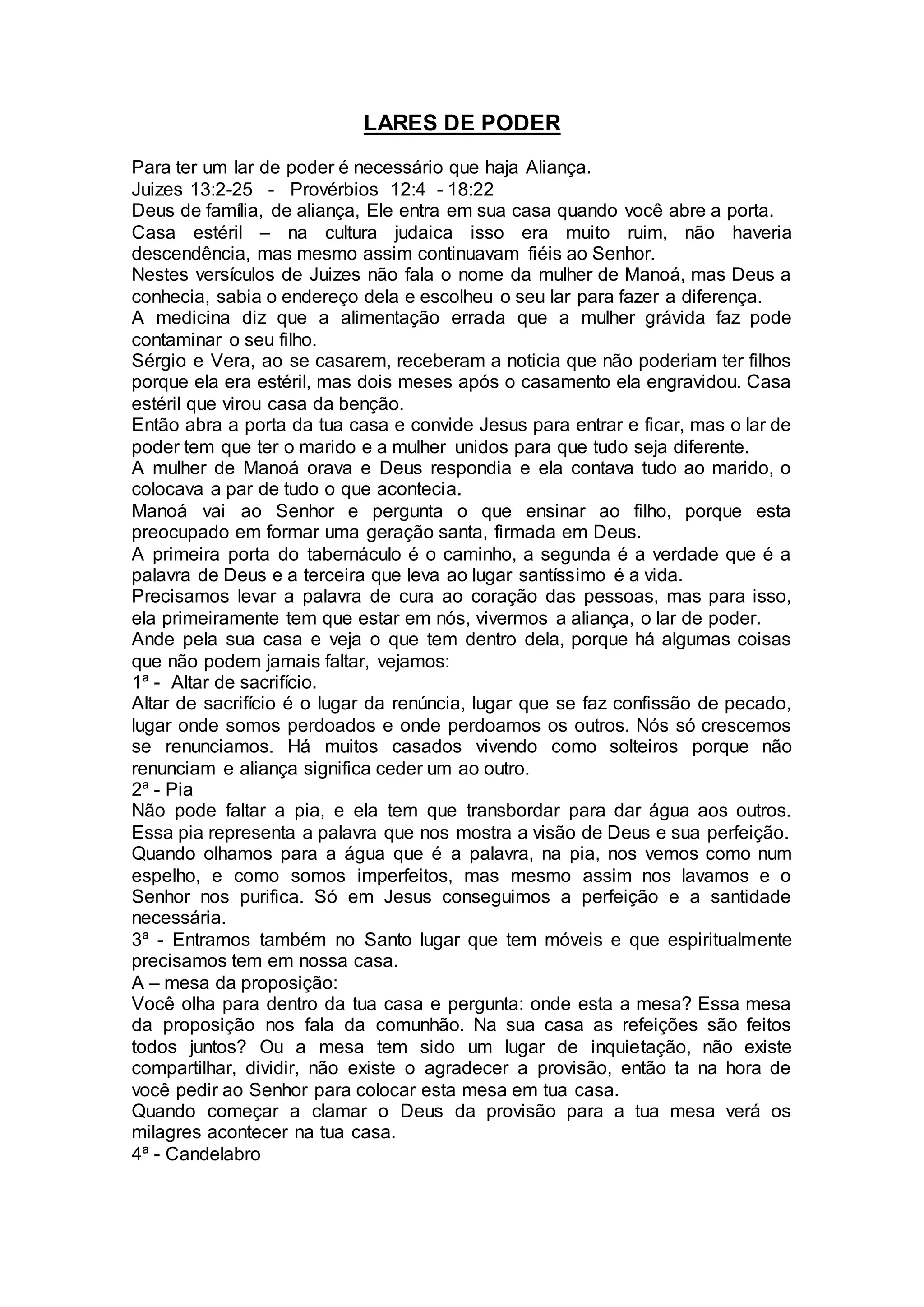 O documento discute os elementos essenciais para se ter um lar de poder, incluindo a aliança entre marido e mulher, a presença de Deus na casa, e itens como o altar de sacrifício, a pia, a mesa da proposição e a arca da aliança.
