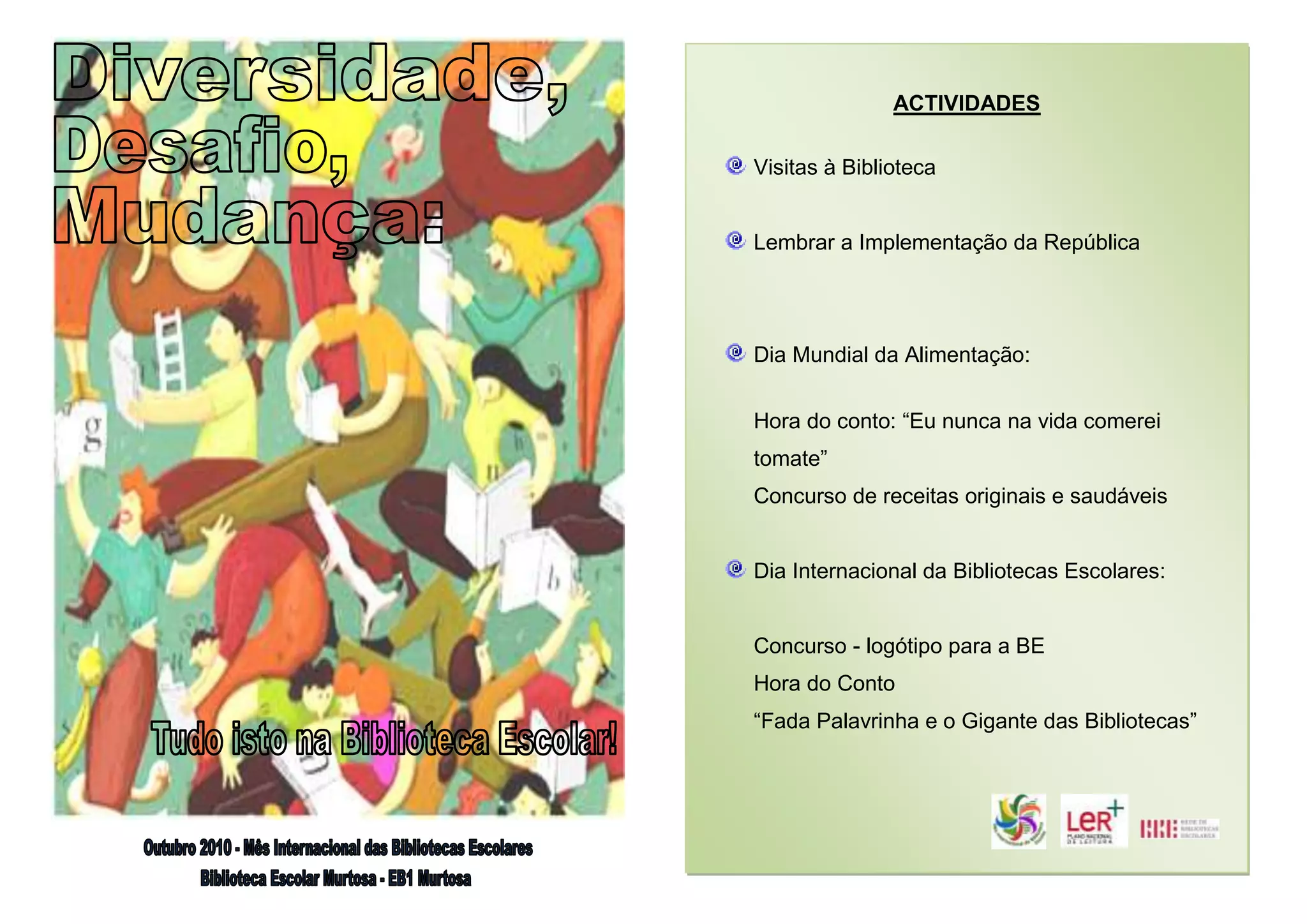 O documento lista atividades para comemorar datas importantes como o Dia Mundial da Alimentação e o Dia Internacional das Bibliotecas Escolares, incluindo visitas à biblioteca, hora do conto, e concursos de receitas e logotipos para estimular o uso da biblioteca.