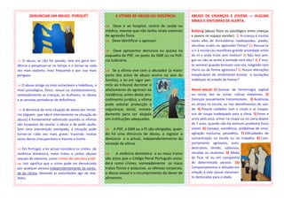 O documento discute violência e abuso, enfatizando a importância de denunciar situações de abuso. Ele fornece informações sobre como identificar sinais de abuso em crianças e adultos, contatos de apoio à vítima, e os passos que uma vítima deve tomar, como procurar atendimento médico e fazer uma denúncia policial.