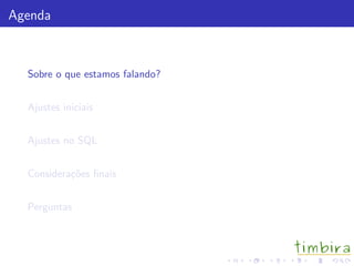 Este documento discute otimizações no PostgreSQL, abordando ajustes iniciais como hardware, sistema operacional e configurações do banco de dados, além de recomendações para modelagem de dados, escrita de consultas SQL e testes/monitoramento. O objetivo é melhorar o desempenho do banco de dados otimizando seus diferentes componentes.