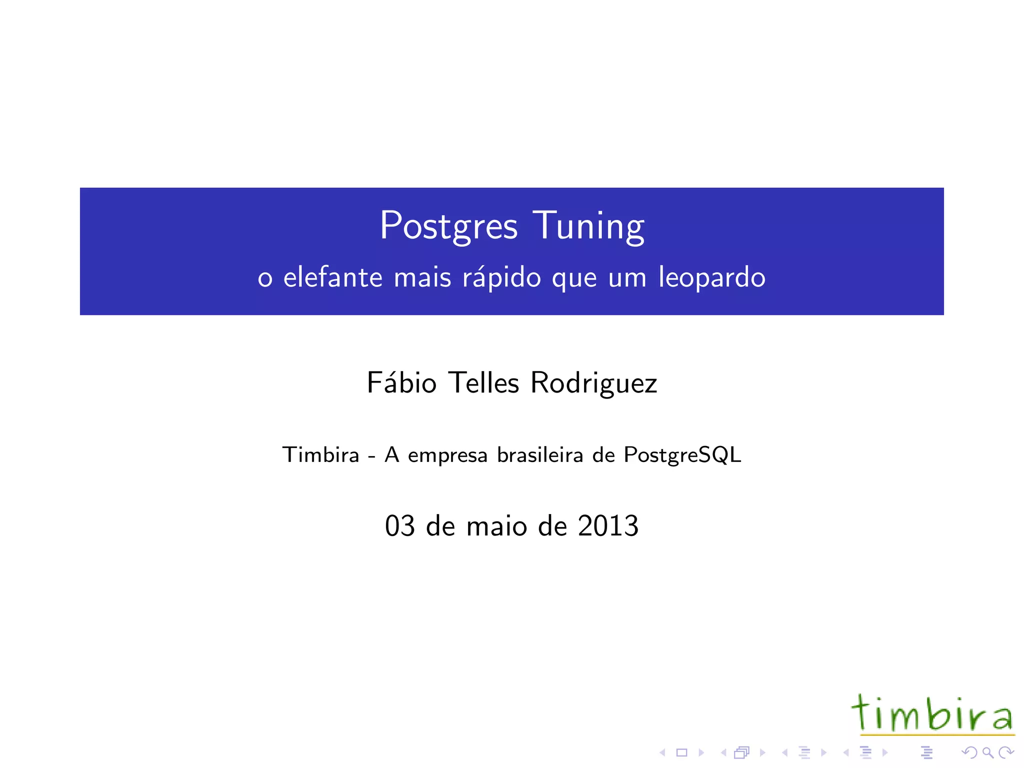 Este documento discute otimizações no PostgreSQL, abordando ajustes iniciais como hardware, sistema operacional e configurações do banco de dados, além de recomendações para modelagem de dados, escrita de consultas SQL e testes/monitoramento. O objetivo é melhorar o desempenho do banco de dados otimizando seus diferentes componentes.