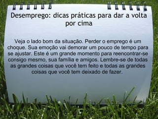 O documento fornece dicas para profissionais de TI que estão desempregados ou procurando uma nova oportunidade de trabalho. Recomenda que eles foquem em atualizar seus conhecimentos, expandir sua rede de contatos, e preparar um discurso curto sobre suas habilidades para entrevistas. Também sugere dedicar tempo diário à busca por novas oportunidades.