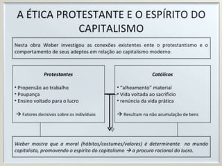 Max Weber analisou como a ética protestante influenciou o espírito do capitalismo e como a racionalização burocrática resultou na "jaula de ferro da racionalidade", limitando a liberdade individual na sociedade moderna. Ele sintetizou ideias de Durkheim e Marx ao considerar a subjetividade e a importância da cultura, além dos fatores econômicos. Sua análise da racionalização mostrou como o mundo moderno se tornou sem alma.