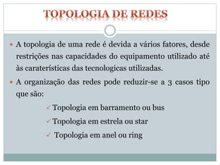 O documento discute diferentes tipos de topologias de rede, incluindo barramento, estrela e anel. Também descreve LANs, MANs, WANs e outros tipos de redes, além de definir computadores cliente e servidor e discutir endereçamento IPv4 e IPv6.