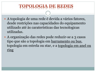 Existem três principais tipologias de redes: barramento, estrela e anel. Estas topologias dependem de fatores como as limitações do equipamento e as características das tecnologias utilizadas. As redes também podem ser classificadas de acordo com sua dimensão geográfica, capacidade de transferência e topologia.