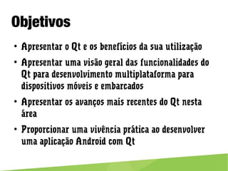 O documento apresenta uma visão abrangente sobre o desenvolvimento de aplicações Android usando o Qt, destacando suas funcionalidades e vantagens como uma ferramenta multiplataforma madura e produtiva. Inclui detalhes sobre a tecnologia Qt, suas gui, a história do Qt no mundo mobile, incluindo suporte ao Android e procedimentos de configuração. O autor também menciona a estabilidade do Qt para Android em produção e convida à participação na comunidade KDE.