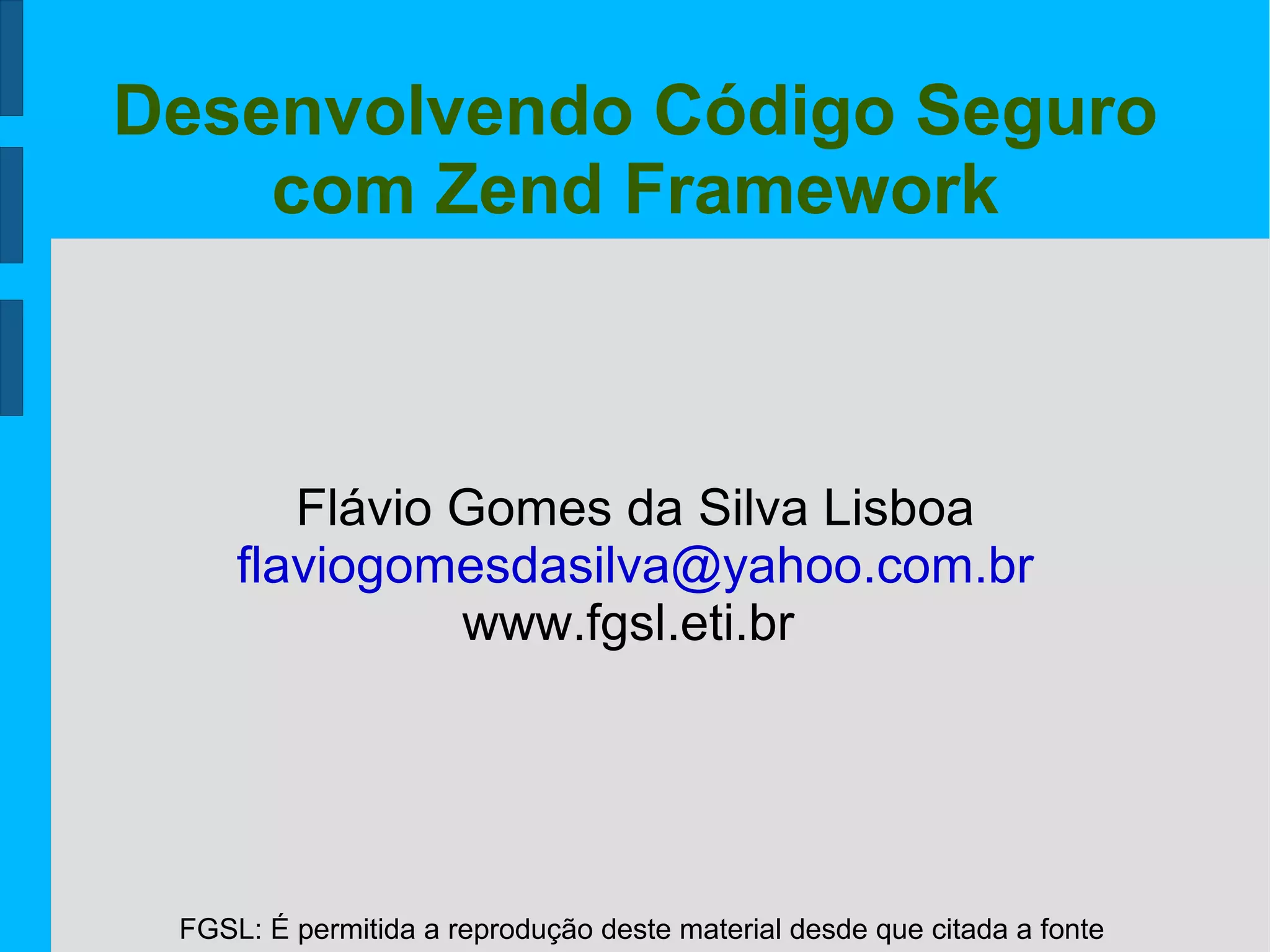 O documento discute a importância da segurança no desenvolvimento de código, especialmente usando o framework PHP Zend. Ele apresenta conceitos como filtros de dados, listas de controle de acesso e autenticação. O documento também discute mitos sobre segurança, como a ideia de que segurança é opcional, e enfatiza a necessidade de abordagens de segurança em camadas.