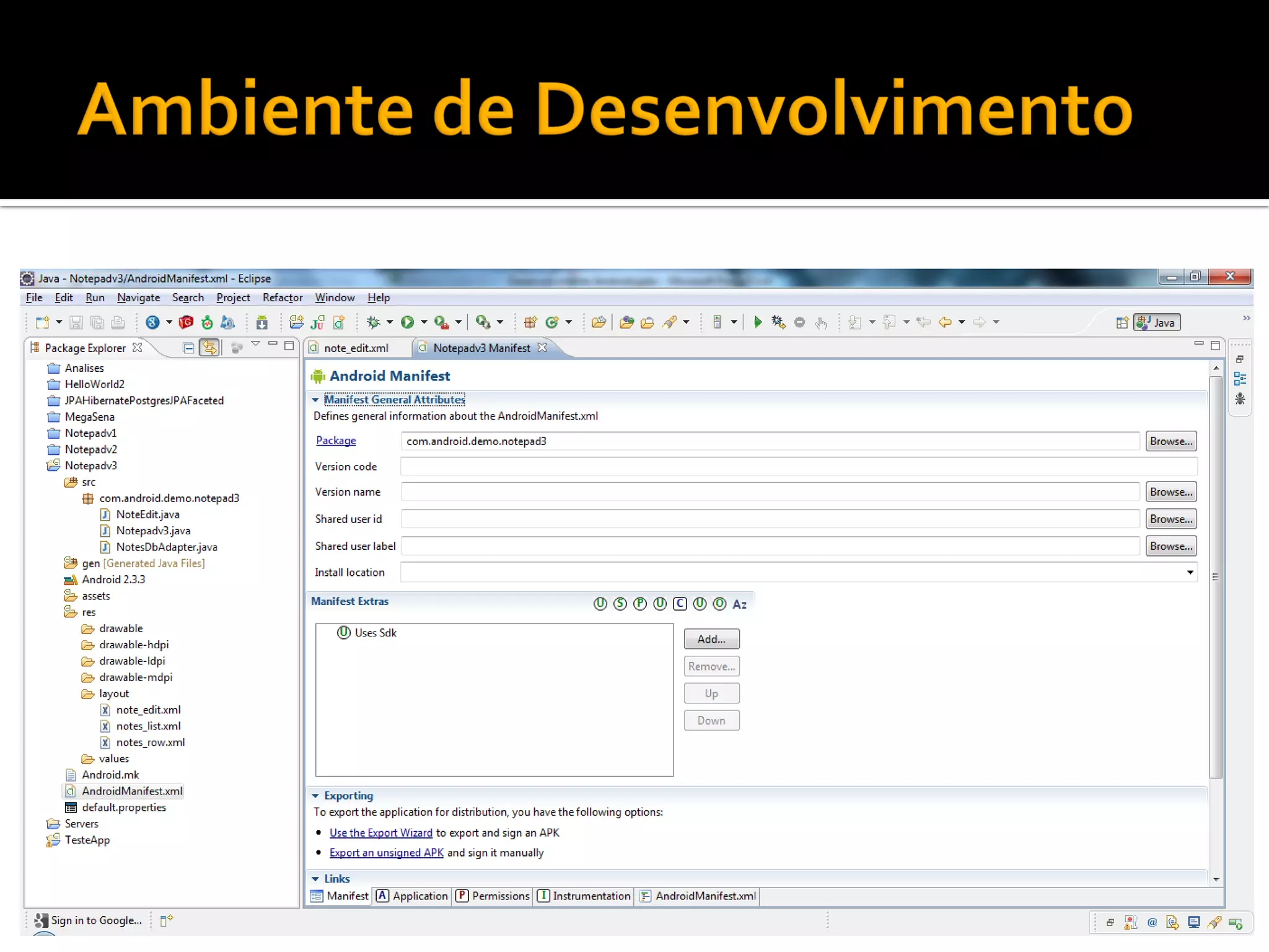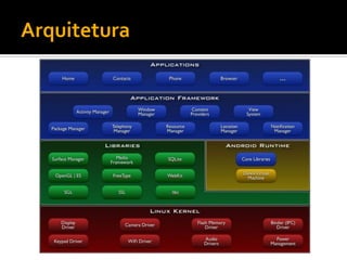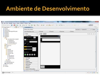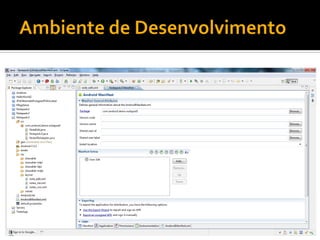 O documento fornece um panorama abrangente sobre o desenvolvimento de aplicativos Android, incluindo conceitos básicos, arquitetura do sistema, ambiente de desenvolvimento e práticas recomendadas para otimização. Destaca a importância de usar a versão mínima da API e de testar em diversas versões para garantir compatibilidade, além de discutir o gerenciamento de permissões e a estrutura do pacote .apk. Também menciona ferramentas como o Android SDK e Eclipse para facilitar o desenvolvimento e publicação de aplicações na plataforma.