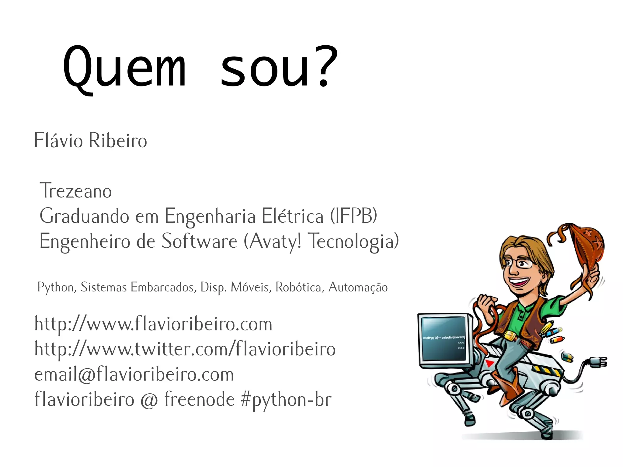 Flávio Ribeiro apresenta sobre sistemas embarcados e desenvolvimento de software para esses sistemas usando Python. Ele discute conceitos de sistemas embarcados, por que usar Python, e dicas para desenvolvimento eficiente como desacoplamento, uso de threads e otimização.