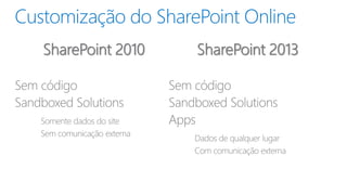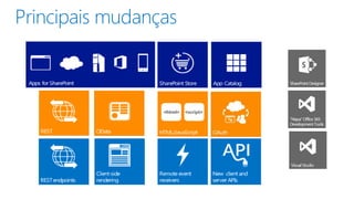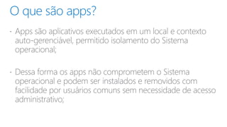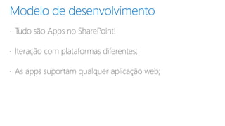 Apps são programas que podem ser instalados em dispositivos como smartphones, tablets e PCs. Elas permitem que empresas desenvolvam soluções personalizadas para SharePoint e disponibilizem essas apps em um catálogo corporativo para que usuários finais possam instalá-las.