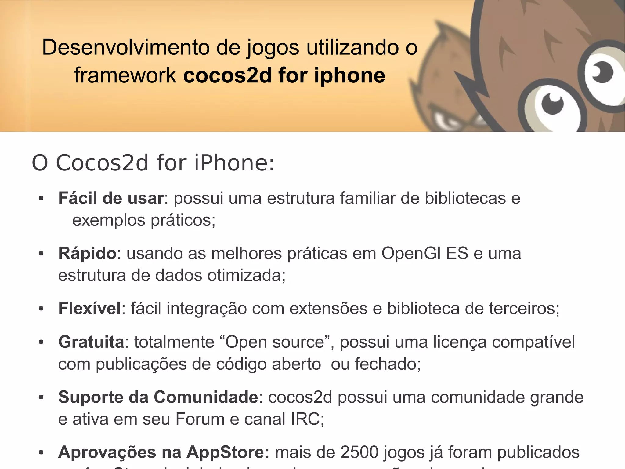 O documento descreve o framework Cocos2d para desenvolvimento de jogos para iOS, destacando que ele é fácil de usar, rápido, flexível, gratuito, com grande suporte da comunidade. Detalha recursos como gerenciamento de cenas e camadas, sprites e sprite sheets, ações, suporte a tile maps, engines físicas e outros recursos como partículas, menus e som.