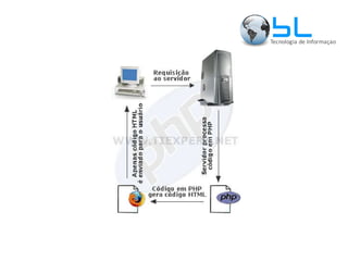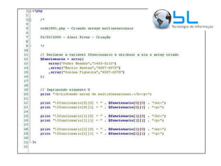 O documento apresenta uma introdução sobre PHP, incluindo sua história, sintaxe básica, variáveis, arrays, estruturas de controle, formulários, métodos GET e POST, includes, cookies, sessões e envio de email. É apresentado um exemplo completo de um sistema de login utilizando sessões em PHP.