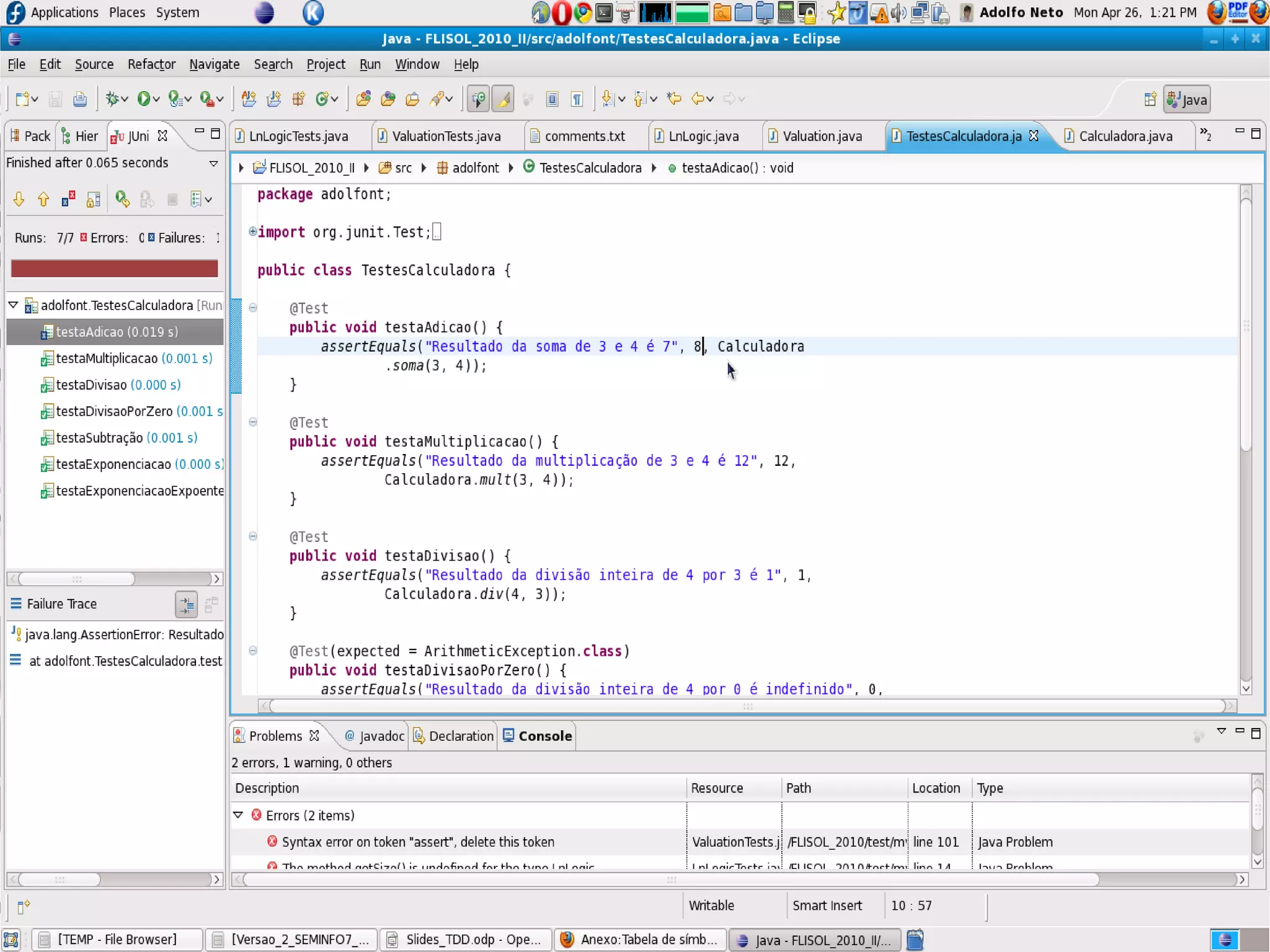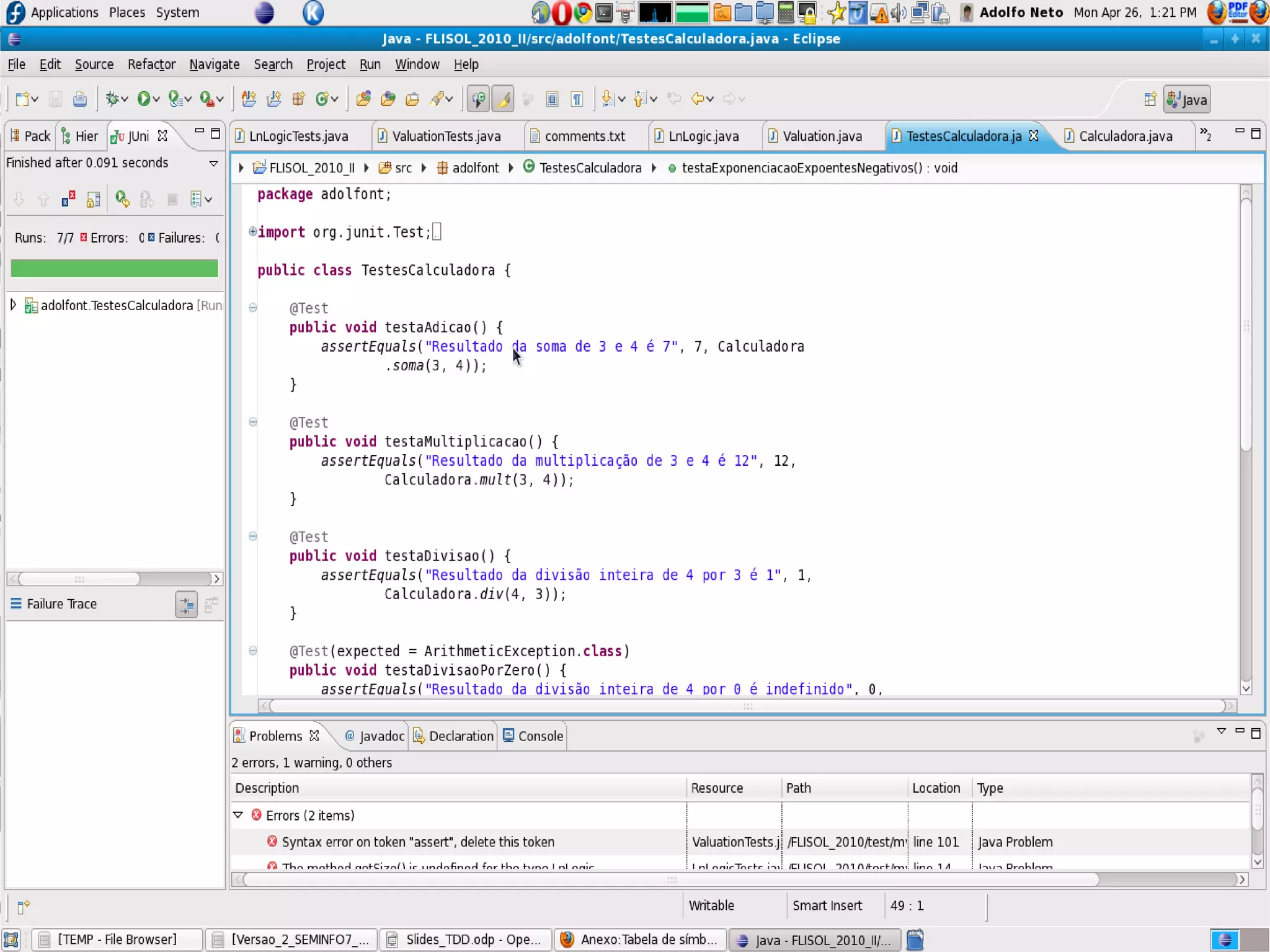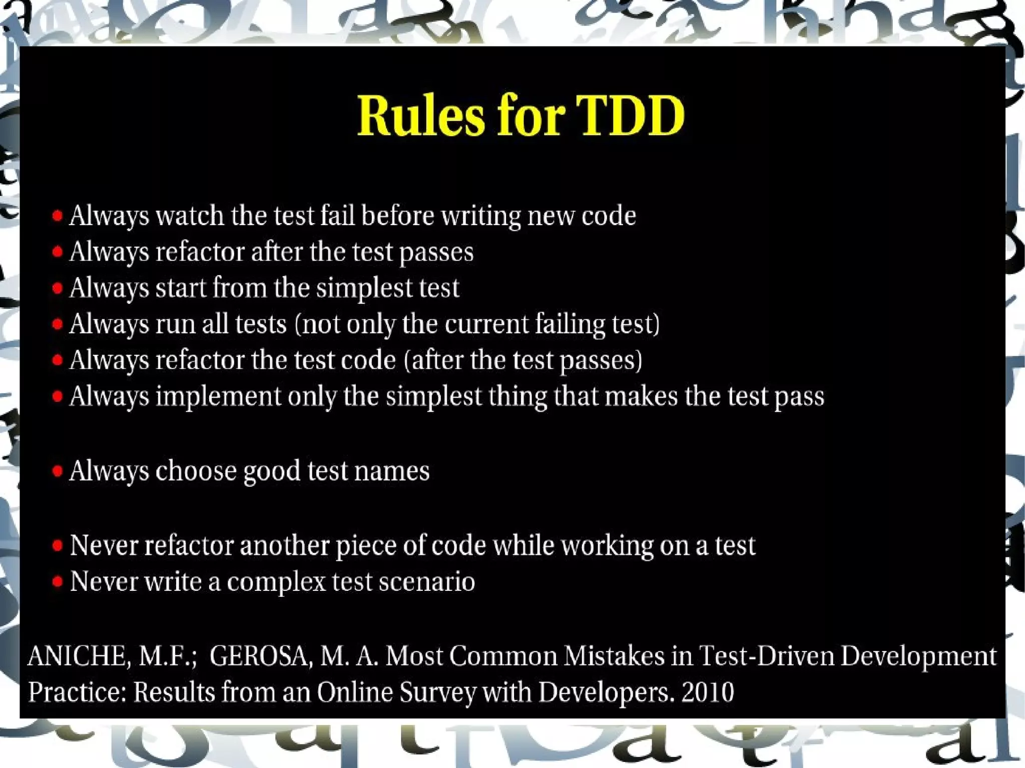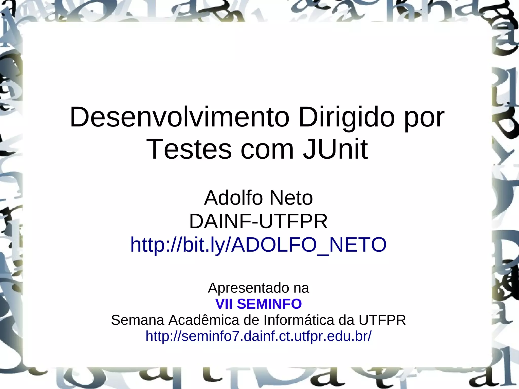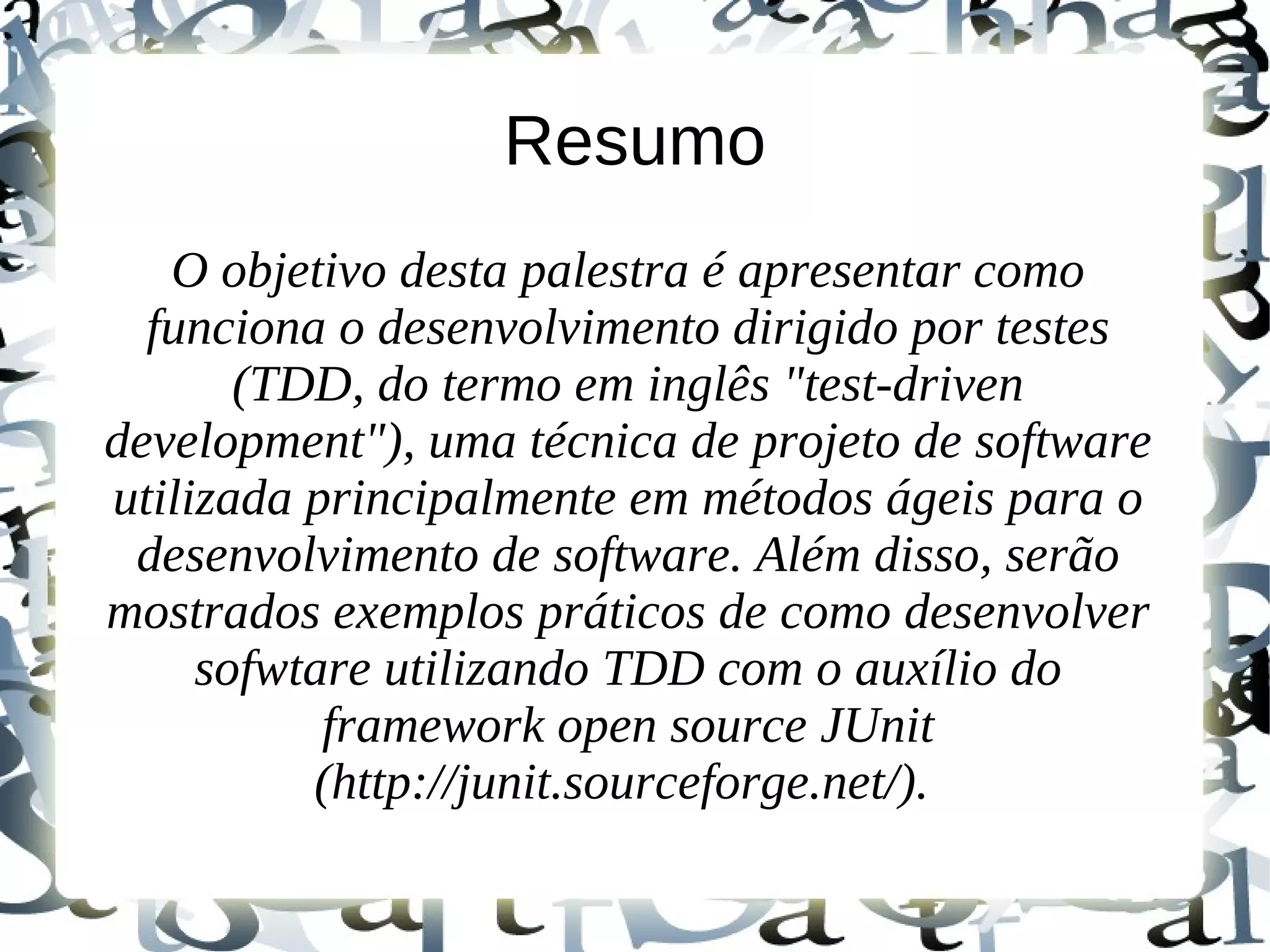 A palestra aborda o desenvolvimento dirigido por testes (TDD), enfatizando sua importância em métodos ágeis para desenvolvimento de software e apresentando exemplos práticos utilizando o framework JUnit. O TDD envolve escrever testes antes do código, permitindo refatoração e melhorias contínuas no design do software. Além disso, discute as concepções errôneas sobre TDD e a sua relação com a qualidade do código.