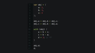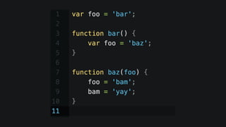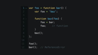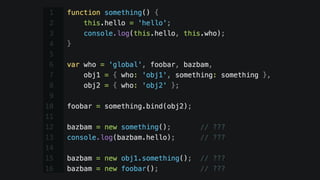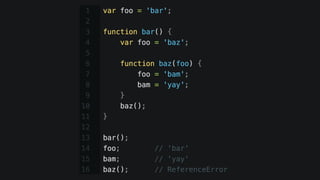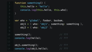 O documento discute conceitos importantes de JavaScript como escopo, hoisting, this, closure e módulos. Ele também apresenta exemplos de IIFE, let, this binding e closure.