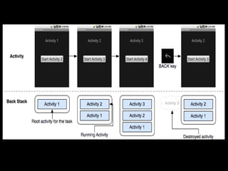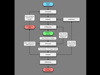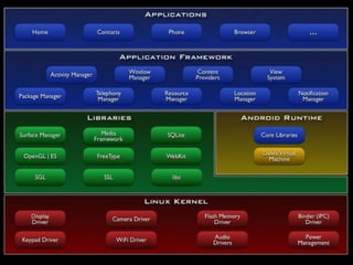 O documento aborda o desenvolvimento para Android, comparando-o com iPhones e discutindo suas características, evolução, e mercado. Apresenta uma linha do tempo das versões do Android e suas inovações, além de destacar desafios como fragmentação e pirataria. Enfatiza a importância do conhecimento entre desenvolvedores e a adaptação das aplicações para dispositivos móveis.