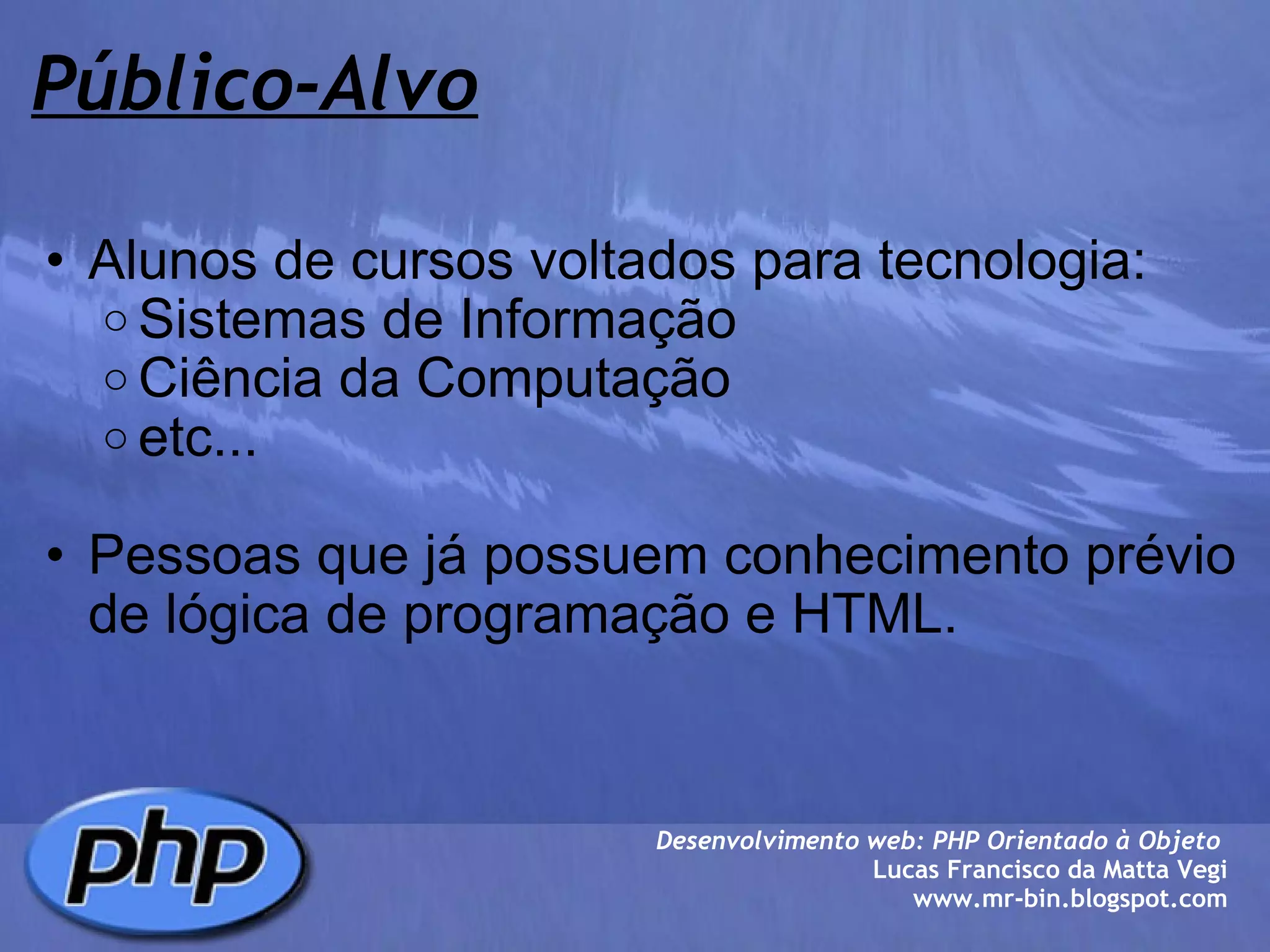 Este documento apresenta um curso de PHP orientado a objetos. O curso tem como objetivo ensinar conceitos básicos de PHP para iniciar projetos de programação orientada a objetos nesta linguagem. O conteúdo programático inclui módulos sobre introdução ao PHP, a linguagem PHP, programação orientada a objetos com PHP e sessões.