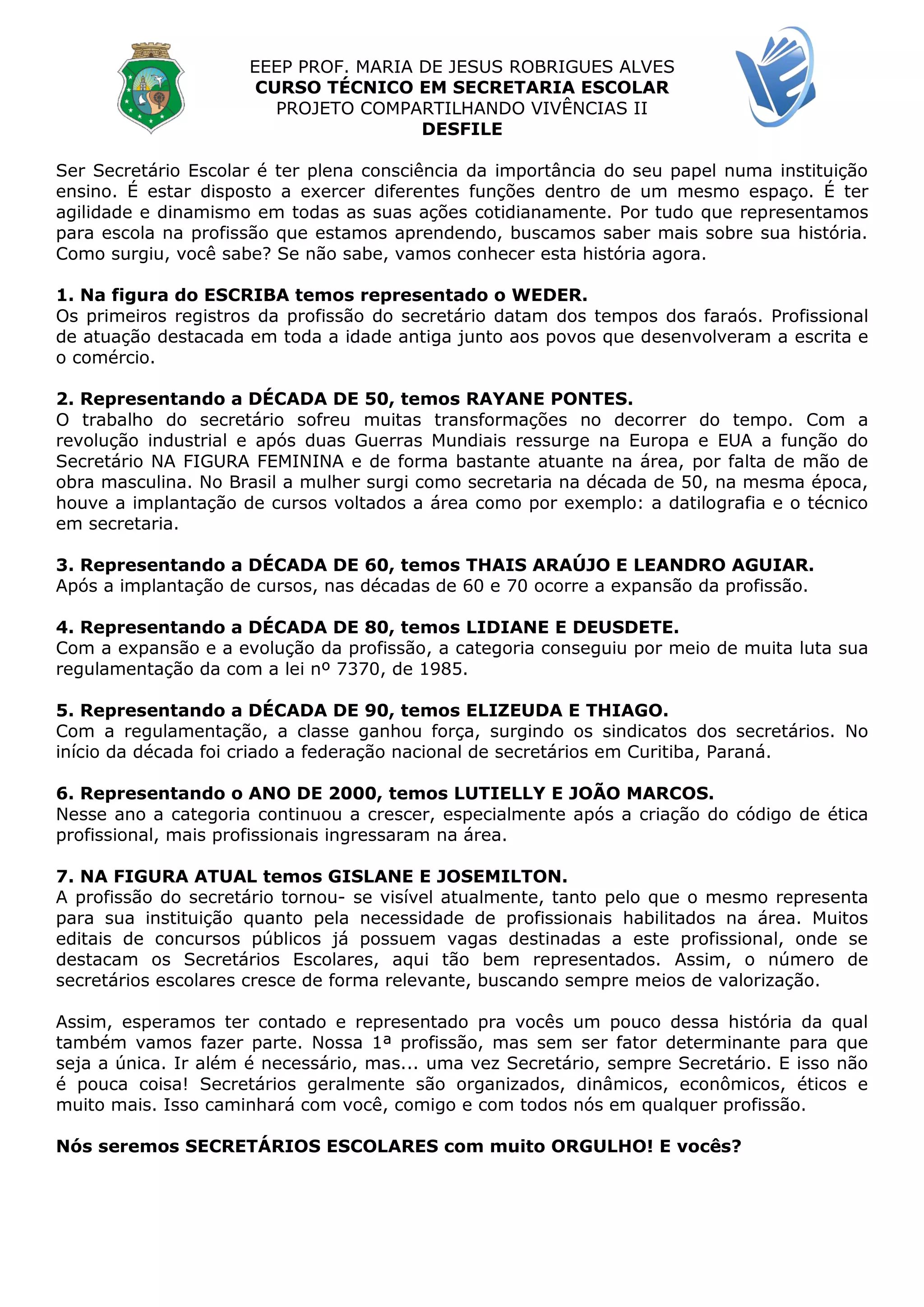 Este documento resume a história da profissão de secretário escolar ao longo dos tempos, desde os escribas da antiguidade até os dias atuais. Apresenta como a profissão evoluiu nas décadas de 1950 a 2000, quando ganhou regulamentação e reconhecimento. Destaca o orgulho de ser secretário escolar e a importância do papel deste profissional nas instituições de ensino.