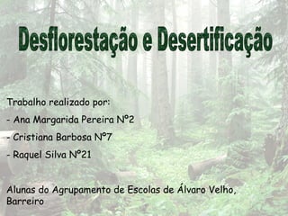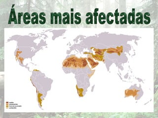 Este documento discute desflorestação e desertificação. Explora suas causas, como expansão agrícola e madeireira, e consequências, como aquecimento global e perda de biodiversidade. Também fornece soluções como gestão sustentável de florestas e recuperação de terras desertificadas através do reflorestamento e rotação de culturas.