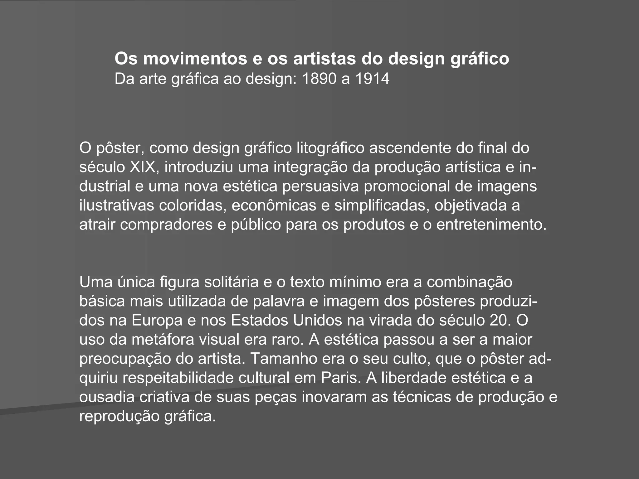 O documento descreve a evolução do design gráfico entre 1890 e 1940 na Europa, desde os primeiros pôsteres litográficos até os movimentos de vanguarda como o futurismo, construtivismo e dadaísmo. Aborda artistas como Jules Chéret, Henri de Toulouse-Lautrec e estilos como Art Nouveau que inovavam técnicas gráficas e a estética dos pôsteres nessa época.
