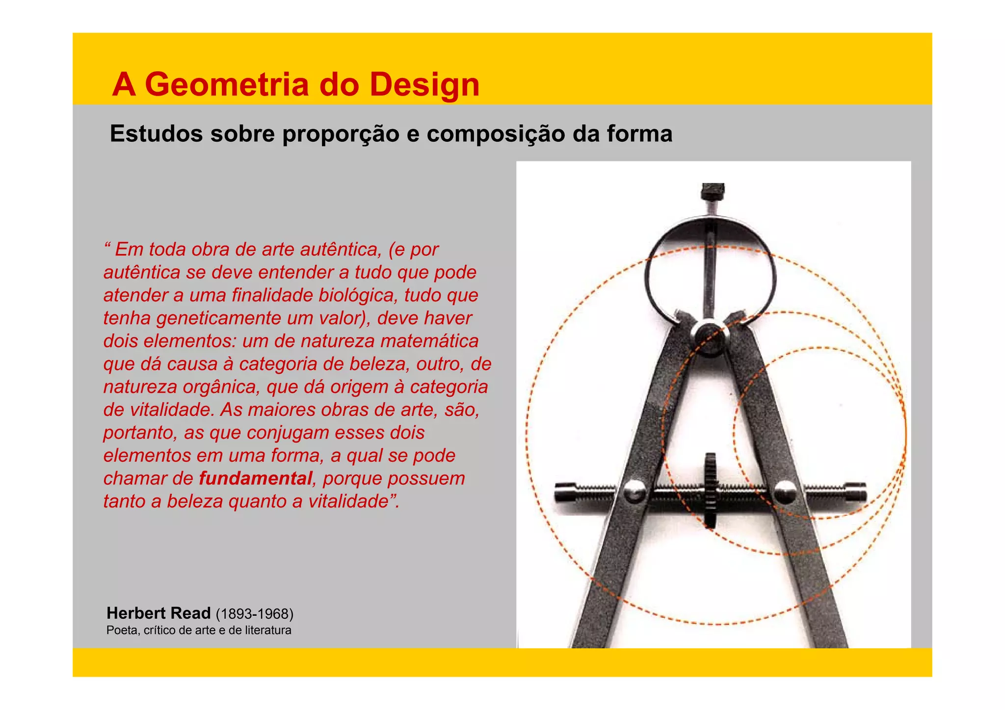 1) O documento discute como proporções geométricas como a seção áurea estão presentes na natureza e na arte, influenciando preferências estéticas humanas.