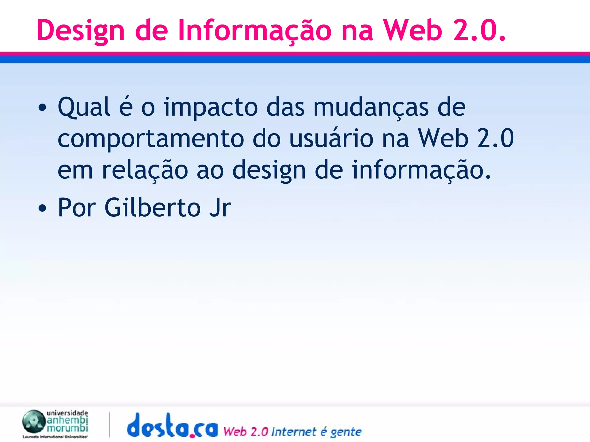 O documento discute os desafios do design de informação na Web 2.0, onde o conteúdo é produzido por usuários ao invés de apenas profissionais. Ele explora como organizar toda a informação gerada por usuários, incluindo através de categorias pré-definidas, associação de palavras-chave e modelos híbridos. O principal desafio é garantir que os usuários encontrem informações relevantes em meio a grande quantidade de conteúdo gerado por usuários.