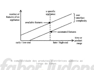 O documento discute o design de interação em produtos eletrônicos. Aborda a complexidade crescente desses produtos, a visão do design de interação como artefato e rede sociotécnica, e as relações entre áreas como design gráfico, de produto e de interface. Também apresenta o perfil do designer de interação e métodos como a propíciação, a colaboração e o método The Bridge.