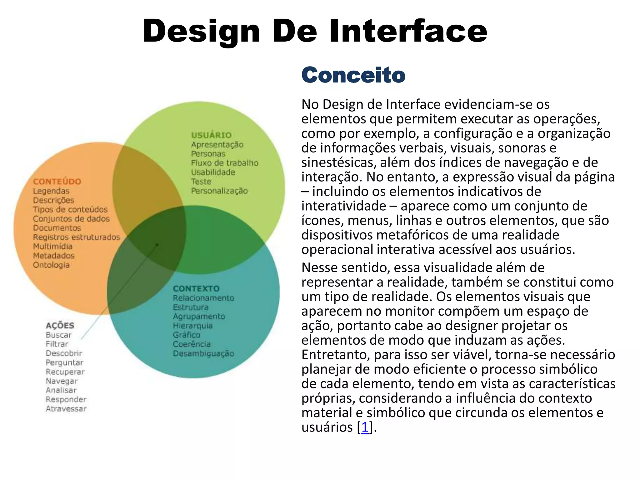 Design De Interface Conceito NoDesign de Interface evidenciam-se os elementos que permitem executar as operações, como por exemplo, a configuração e a organização de informações verbais, visuais, sonoras e sinestésicas, além dos índices de navegação e de interação. No entanto, a expressão visual da página – incluindo os elementos indicativos de interatividade – aparece como um conjunto de ícones, menus, linhas e outros elementos, que são dispositivos metafóricos de uma realidade operacional interativa acessível aos usuários. Nesse sentido, essa visualidade além de representar a realidade, também se constitui como um tipo de realidade. Os elementos visuais que aparecem no monitor compõem um espaço de ação, portanto cabe ao designer projetar os elementos de modo que induzam as ações. Entretanto, para isso ser viável, torna-se necessário planejar de modo eficiente o processo simbólico de cada elemento, tendo em vista as características próprias, considerando a influência do contexto material e simbólico que circunda os elementos e usuários [1].