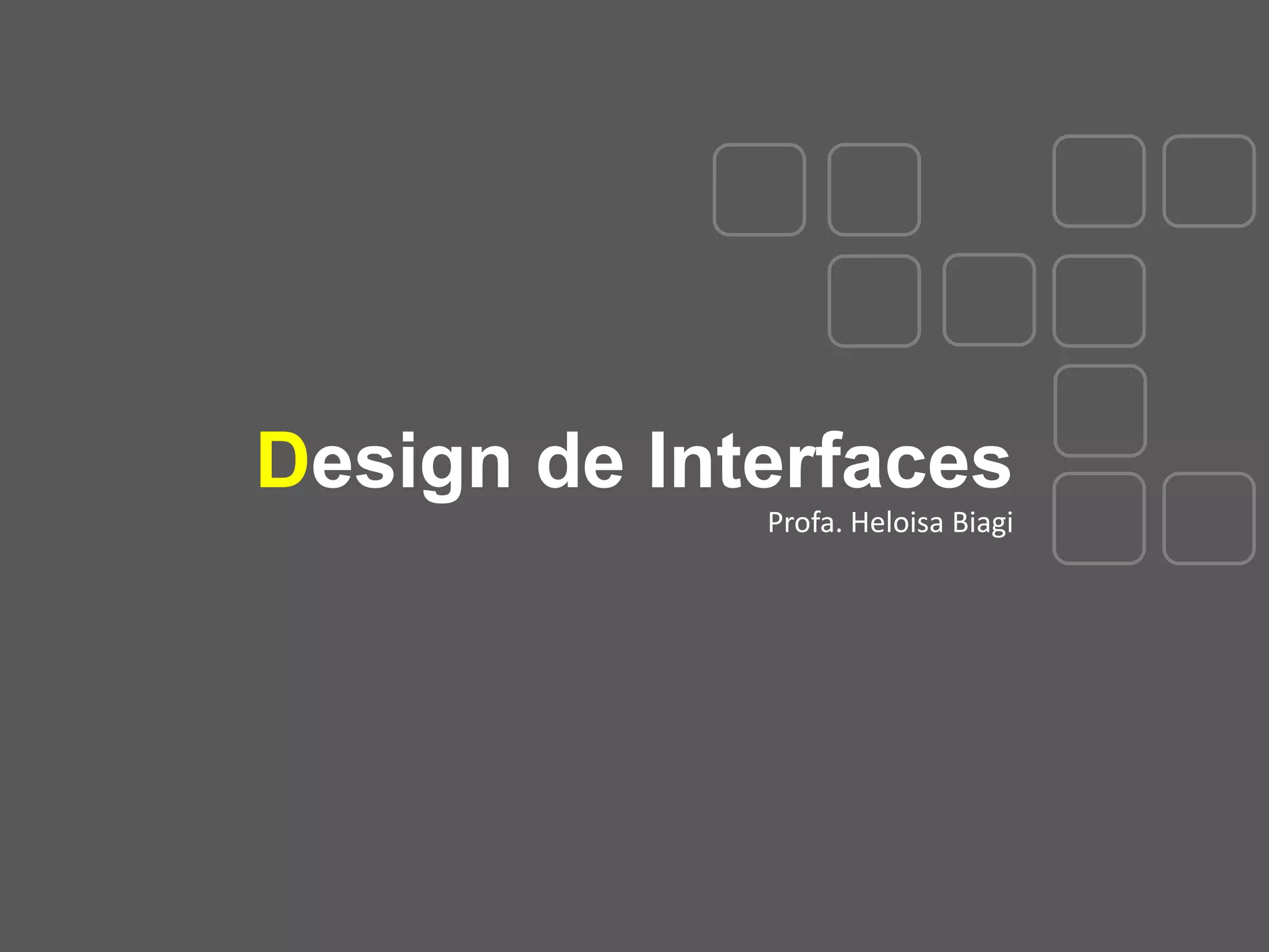 O documento apresenta uma introdução ao curso "Design de Interfaces" ministrado pela professora Heloisa Biagi. O curso tem como objetivos ensinar o uso do software Adobe Fireworks para edição de imagens e vetores, técnicas de planejamento e criação de interfaces, e desenvolvimento de protótipos de interfaces. O documento também fornece uma breve introdução ao Adobe Fireworks, explicando suas principais ferramentas e funcionalidades para edição de gráficos vetoriais e bitmap.