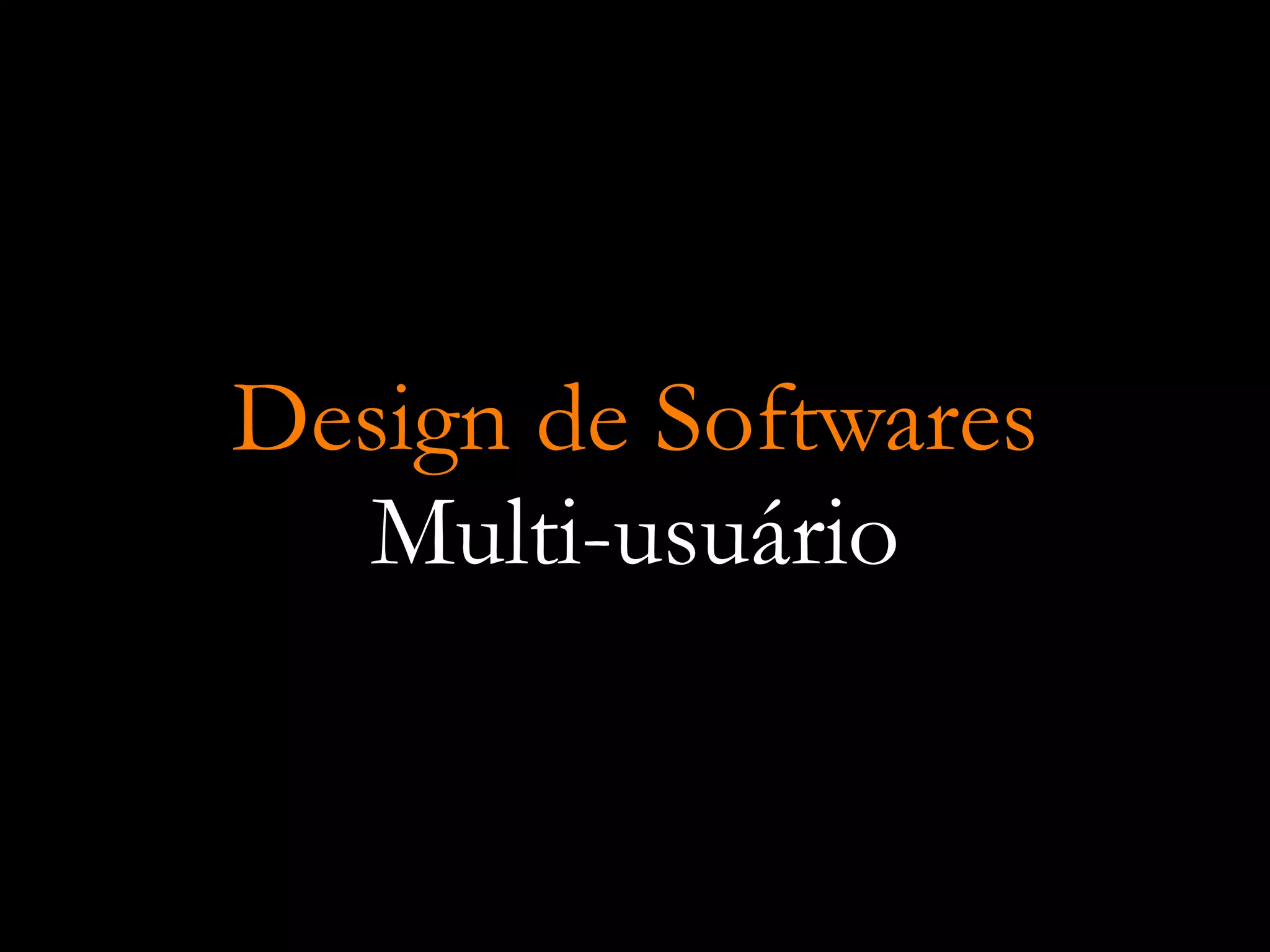 O documento discute o design de softwares multiusuário, definindo-o como um aplicativo utilizado por diferentes pessoas para realizar atividades em conjunto, como cooperação, colaboração ou competição. Exemplos incluem Second Life, Orkut, Moodle e Skype. O documento também aborda categorias sociológicas relevantes para o design desses softwares, como motivação, identidade, cultura, espaço e tempo e coordenação.