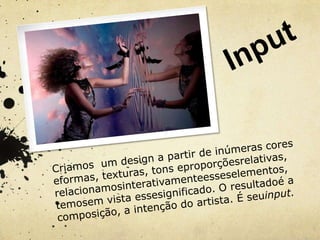 O documento discute os elementos básicos da percepção visual e comunicação, incluindo ponto, linha, forma, direção, cor, tom, textura, escala e proporção. Estes elementos são a matéria-prima para a inteligência visual e expressão de manifestações visuais. A escolha e ênfase destes elementos depende da expressão subjetiva do artista.