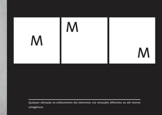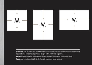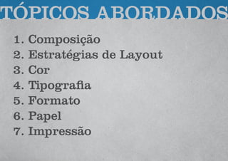 Este documento aborda conceitos básicos de design gráfico, incluindo composição, cores, tipografia e formato. Discutem-se princípios de organização visual como as leis da Gestalt e estruturas composicionais, além de características e sistemas de cores. A tipografia é explicada com exemplos de famílias e elementos de letras.