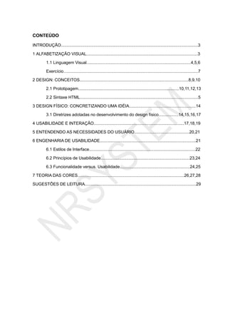 Este documento é uma apostila sobre design de interfaces para internet, focando em aspectos como semiótica, teoria das cores e usabilidade. Ele aborda a importância de criar interfaces intuitivas e acessíveis, destacando técnicas e conceitos para garantir alta usabilidade. A obra é propriedade intelectual do núcleo de educação a distância da NRSYSTEM e estabelece diretrizes sobre reprodução e uso do conteúdo.