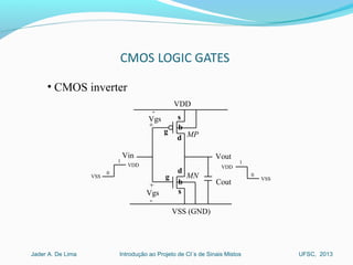 1) O documento discute circuitos lógicos básicos como inversores CMOS, margens de ruído, gatos de Schmitt e dissipação de potência em circuitos digitais.