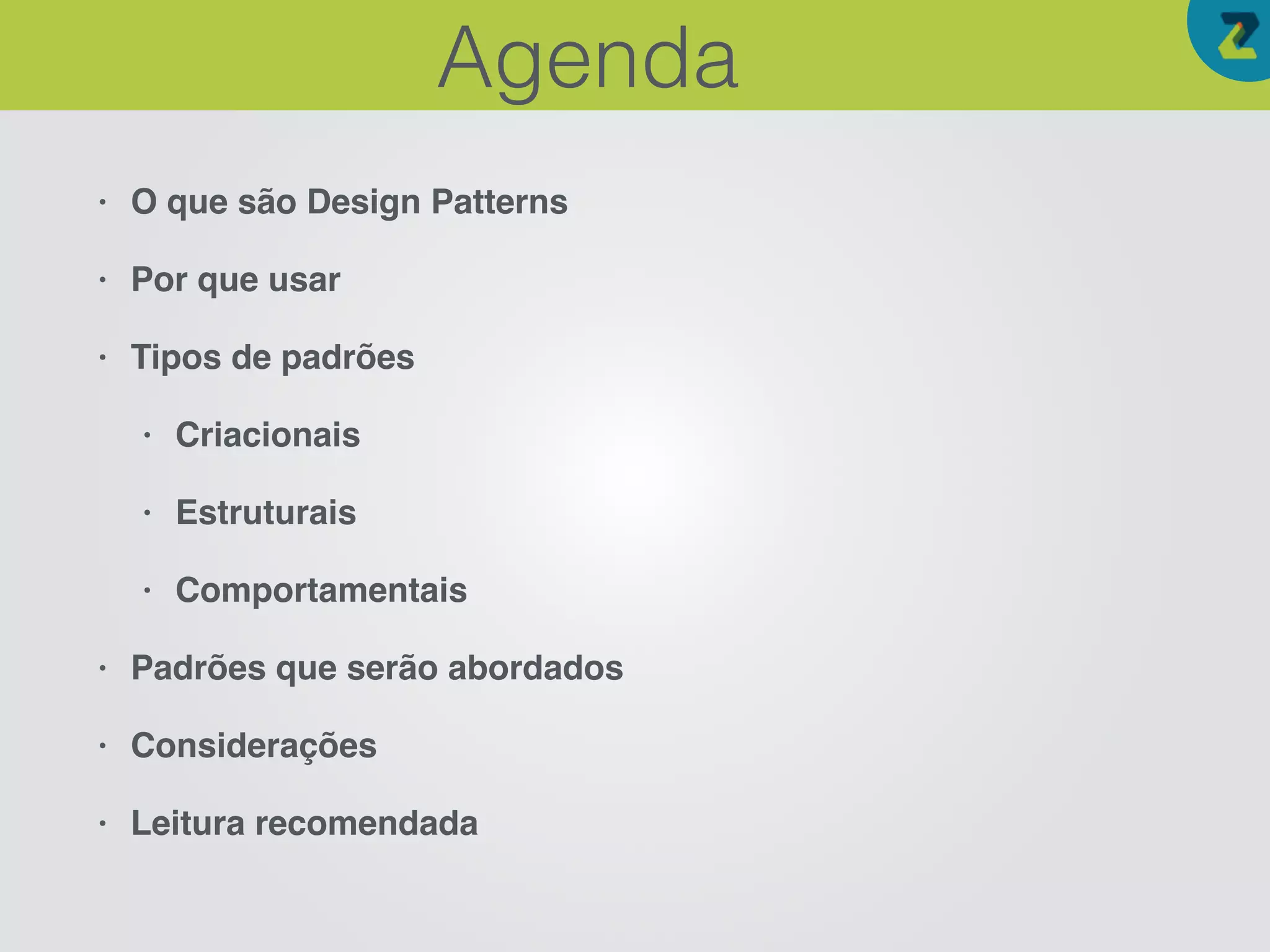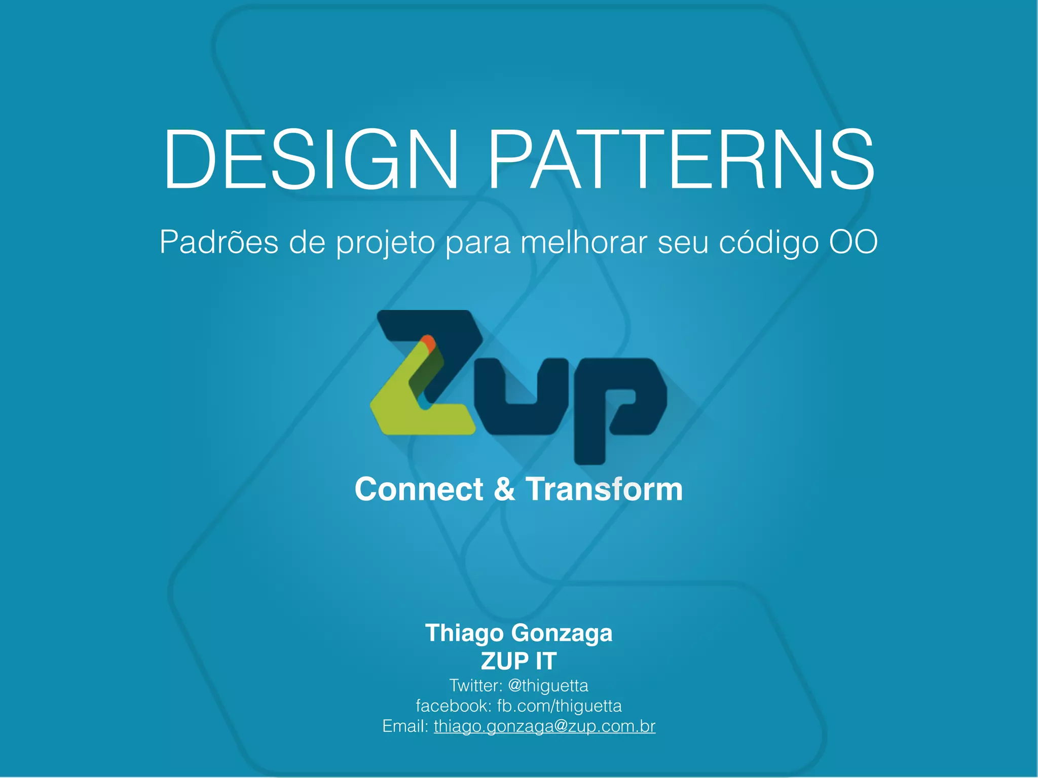 O documento apresenta uma palestra sobre padrões de projeto para melhorar código orientado a objetos. Aborda o que são padrões de projeto, por que usá-los e os principais tipos: criacionais, estruturais e comportamentais. Apresenta alguns padrões específicos e considerações finais sobre melhorias contínuas de código.
