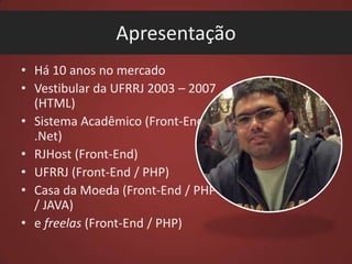 O documento apresenta uma visão geral sobre design responsivo, enfatizando a adaptação de layouts para diferentes dispositivos. Rafael França, com vasta experiência em front-end, discute o uso de media queries e frameworks populares como Bootstrap e Foundation. O design responsivo é crucial para garantir uma navegação eficiente e conteúdo acessível em diversos formatos de tela.