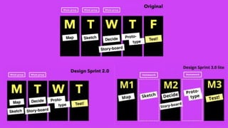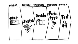 O documento fornece informações sobre Design Sprint, uma abordagem para resolver grandes problemas e testar novas ideias em até 5 dias. Ele explica o que é Design Sprint, quando e como usá-lo, seus benefícios, os participantes envolvidos e os passos de cada um dos 5 dias do processo.