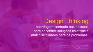 O documento descreve o processo de Design Thinking para encontrar soluções colaborativas e multidisciplinares para problemas. O processo envolve a interpretação do problema, a geração de ideias, a experimentação com protótipos, e a evolução contínua da solução com base no feedback dos usuários.